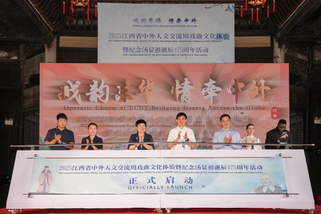 9月24日,“戏韵东华 情牵中外——2025江西省中外人文交流周戏曲文化体验暨纪念汤显祖诞辰475周年”活动在抚州市玉隆万寿宫举行。抚州市政府副市长蔡青,东华理工大学党委常委、副校长邓居智,江西省教育国际合作与教师发展中心副主任黄爱兵致开幕辞,并共同为“东华理工大学中外学生人文交流活动基地”揭牌。